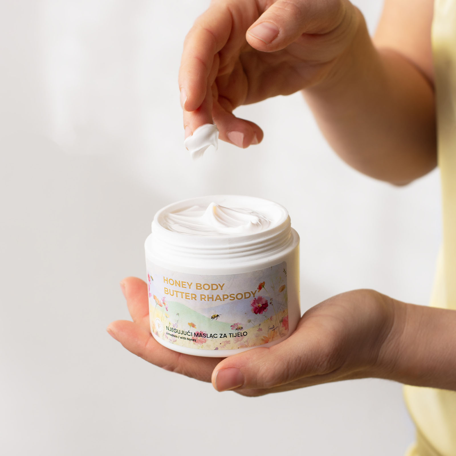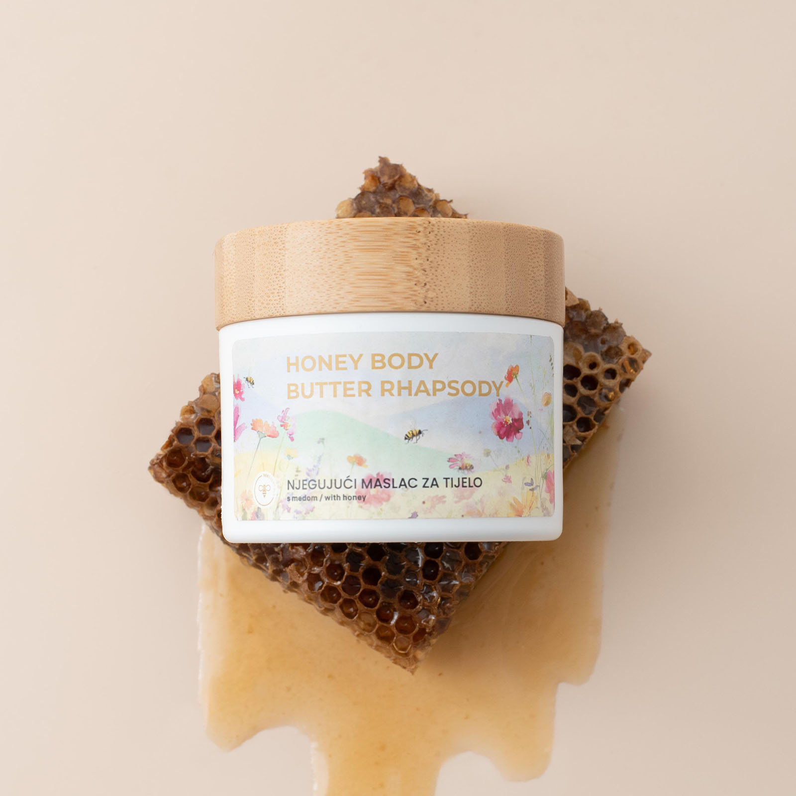 Njegova tekstura topi se pod prstima, ostavljajući kožu mekom, mirisnom i zaštićenom, bez osjećaja težine. Med djeluje kao prirodni humektant – zadržava vlagu u koži, štiti je od isušivanja i potiče regeneraciju. Svaki sloj ovog maslaca priča priču o njezi koja dolazi iz prirode, a stvorena je s ljubavlju, znanjem i odgovornošću.